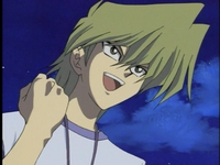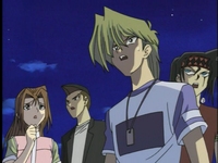 Mai admits that Kaiba’s blimp is very nice, and he spared no expenses with getting things prepared, but she is ready to start dueling right away. Yugi wishes Mai the best of luck in the finals. Mai says, “Who needs luck?” Joey can’t believe Kaiba prepared so much fancy food and made it “all you can eat”. He’ll be sorry when Joey is done with all of it! Joey, who is holding a plate filled with food, notices Marik standing near a corner. Joey can’t stand him. He tells himself that Marik will pay for controlling his mind. While worrying about Marik, Joey accidentally bumps in Bakura. Joey apologizes, and Bakura says it’s all right. Everyone seems to be on the edge. Joey asks Bakura how he qualified for the finals so quickly. Bakura calmly says that he won all six locator cards at once. He tells Joey about his duel with Bonz and his friends at the cemetery. When Bakura defeated them, he “forced” them to give up their locator cards. This creeps Joey out. He hopes he doesn’t have to duel Bakura in the first round.