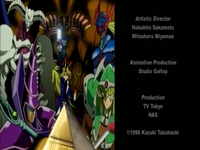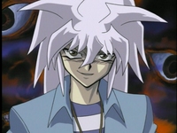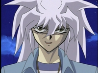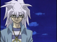 Bakura asks Yugi if he’s prepared to lose it all. Yugi says he won’t lose. Before the duel begins, Yugi asks Bakura to reveal his true self. Bakura laughs. The Millenium Ring appears on Bakura’s neck. Joey, Tristan and Téa notice it right away. However, Tristan is confused since he got rid of the Millennium Ring back at Duelist Kingdom. Tristan doesn’t know how Bakura got it back, but he knows that it isn’t good. In an innocent matter, Marik asks what is around Bakura’s neck. Joey explains that Yugi and Bakura have old items with magic powers. Yugi’s item is good, but Bakura’s item is bad. Téa says that an evil spirit lives in that ring. Marik says that it’s hard to believe that an evil spirit is up there dueling Yugi. Joey just hopes that it doesn’t drag Yugi into the Shadow Realm.