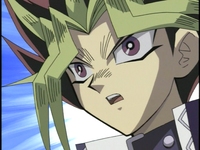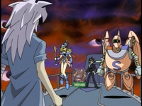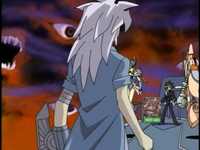 Yugi demands to know why Bakura entered this tournament. He wonders if it’s about the Millennium items. Bakura tells himself that Yugi knows he desires the Millennium items. What Yugi doesn’t know is how he plans on getting them. First, he’ll win Slifer the Sky Dragon from Yugi and trade it over to Marik for the Millennium Rod. Then stripping Yugi of his Millennium Puzzle will be a simple task. Bakura taunts Yugi by telling him that he may not be working alone, and one of Yugi’s friends could be his greatest enemies. Yugi doesn’t believe Bakura at all, since lies are a part of Bakura’s game. Marik tells Bakura that he’s giving away too much information. He tells Bakura that he will play by his rules, unless Bakura wants his mind to be controlled. Bakura fights back by saying Marik would have defeated Yugi by now when he had the chance, so Bakura decides to take his chances.