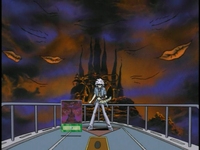 Yugi tells Bakura that he was a fool not to attack. He draws and then sacrifices Gazelle in order to summon Dark Magician Girl. Bakura says that his “fairy” is too weak to destroy Dark Necrofear. Yugi agrees, but Bakura forgot about one thing: his face down card! Yugi activates a Magic card, Magic Formula, which raises the attack points of Dark Magician Girl by 500. Dark Magician Girl attacks and destroys Dark Necrofear. Bakura thanks Yugi for doing exactly what he wanted. Now that Dark Necrofear is in the graveyard, he can activate a field Magic card. So Bakura plays this field card known as Dark Sanctuary, and soon the entire field becomes surrounded by dark magic. A bunch of evil eyes and mouths surround the playing field. Bakura states that everything had to go exactly as planned in order for his strategy to work, and Yugi helped him do that perfectly. Yugi asks, “Now what?” Bakura tells him to prepare himself for an evil that he has never experienced before!