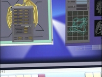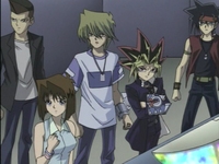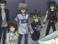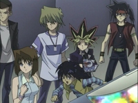 Everyone meets at the dueling arena. Roland announces that as soon as the eighth duelist arrives, the duel can begin. Tristan wonders who this eighth duelist is. Yugi hopes the duelist isn’t working for Marik. Kaiba tells himself that his Egyptian God card will crush the eighth duelist. Suddenly, Kaiba gets a call from Mokuba. Mokuba reports that The Winged Dragon of Ra has been successfully loaded in to the main frame and that the network is currently translating the card. Kaiba tells Mokuba to report back when the network has finished translating the card.
