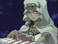 Suddenly, the elevator doors open. The eighth duelist has arrived! Roland announces that this duel will take place. He tries to announce the duelists’ names, but he doesn’t know the name of the eighth duelist. Kaiba tells the eighth duelist that she has some nerve showing up late. Was she scared, or did the thought of dueling Kaiba make her second guess her own abilities? Kaiba demands to know who she is. The eighth duelist takes off her scarf. Yugi is shocked to see who it is. Roland asks for the eighth duelist’s name. The eighth duelist introduces herself as Ishizu Ishtar. The good Marik tries to call out for his sister, but the evil Marik tells him to stay out of his way. Téa tells Yugi that she’s the same woman they met at the museum. Yugi remembers her and her Millennium Necklace. Kaiba also recognizes Ishizu. He asks if she has come back to take Obelisk the Tormentor. Ishizu says that she has come back to save her brother Marik. For 5000 years, an Ishtar has guarded the Pharaoh’s tomb; however, Marik turned his back against his family, and the evil within him grew stronger. Joey says one Ishtar is bad enough. Who needs two? Tristan thinks she can’t be any worse than Marik, and Duke agrees. Ishizu knows that there is still good buried inside her brother. The good Marik tries to call out for Ishizu again. This time, the evil Marik seals his other half away in a glass pyramid inside the Shadow Realm.